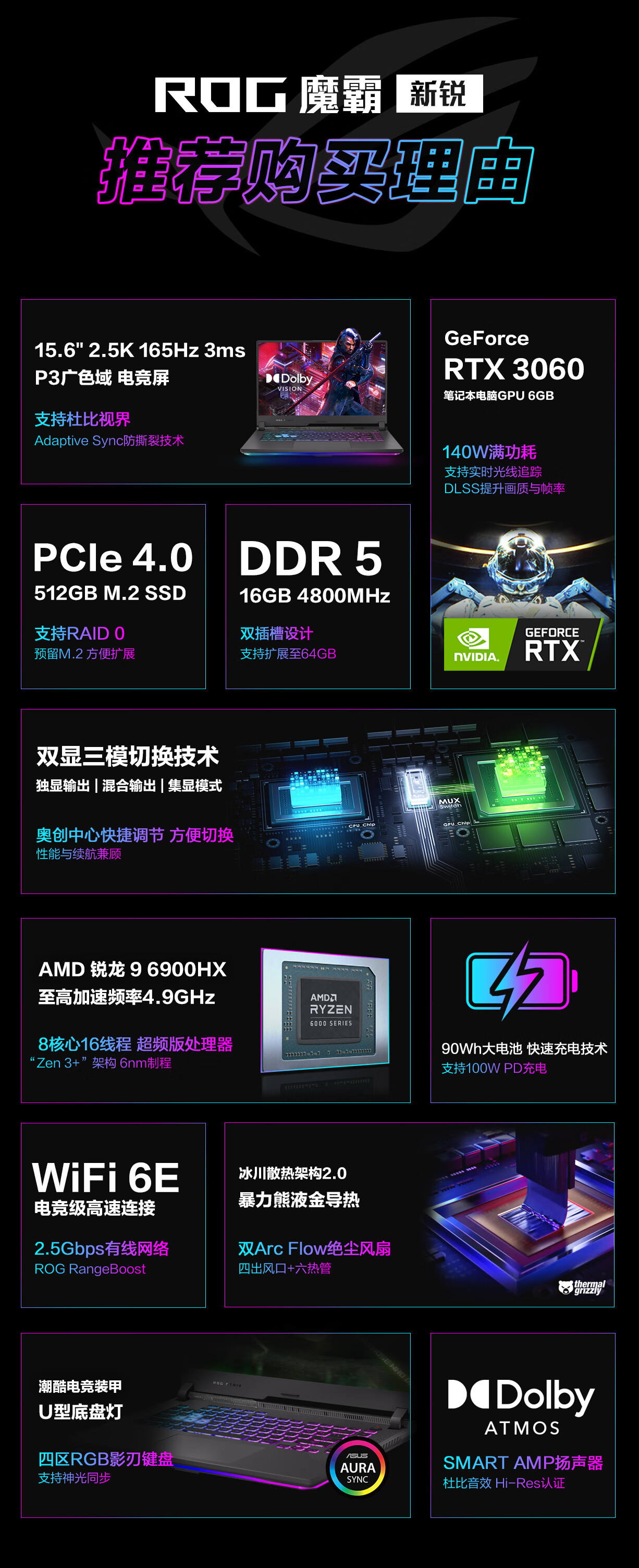 商品名稱:ROG魔霸新銳2022 15.6英寸2.5K 165Hz游戲本筆記本電腦(R9-6900HX 液金導(dǎo)熱 16G 512G RTX3060 140W)