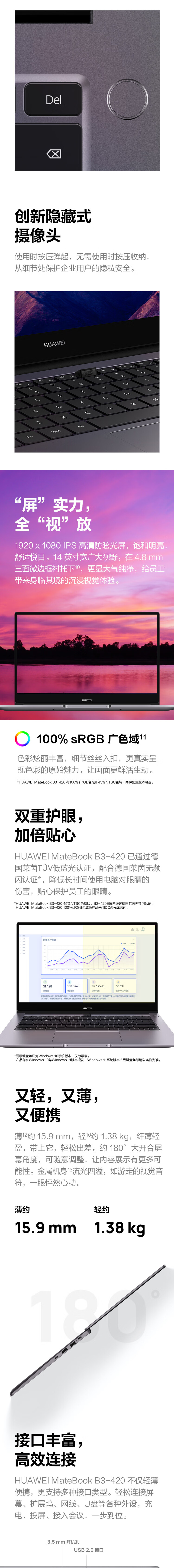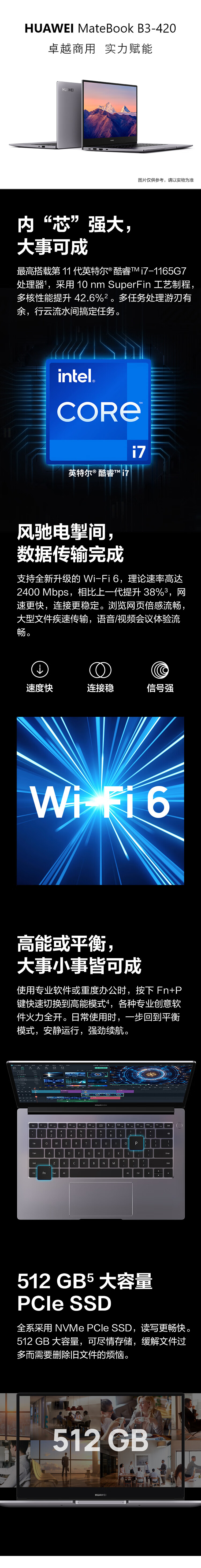 商品名稱(chēng):華為筆記本電腦 MateBook B3-420 14英寸輕薄本 (i7-1165G7 16G 512G) 深空灰